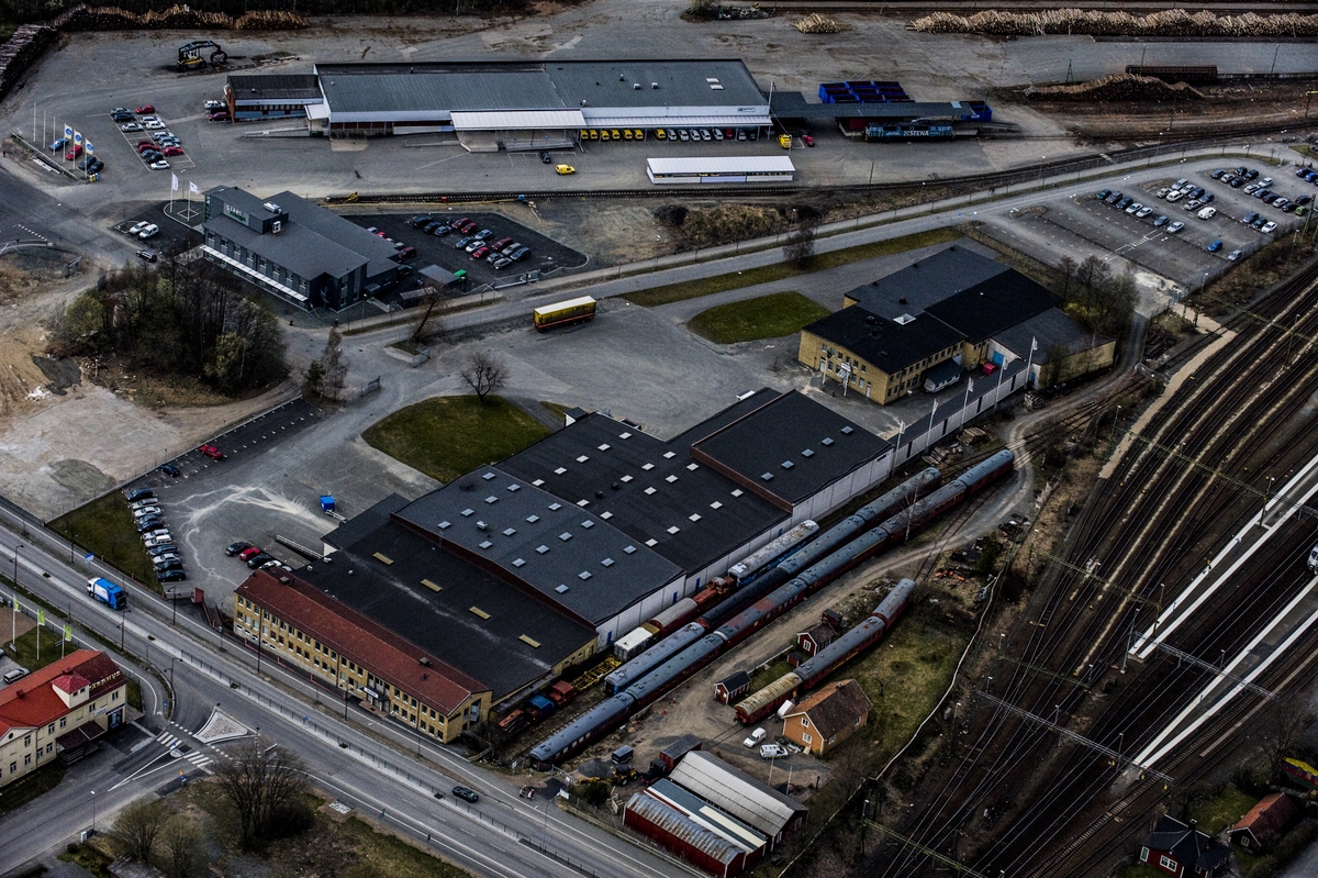 Flygfoto över företaget Nevotex (närmast i bild) och Postterminalen i Nässjö.