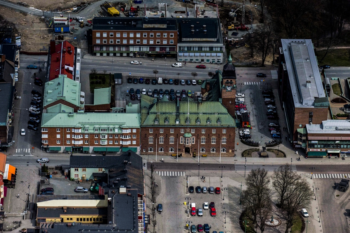 Flygfoto över Nässjö stadshus och tillhörande kvarter.