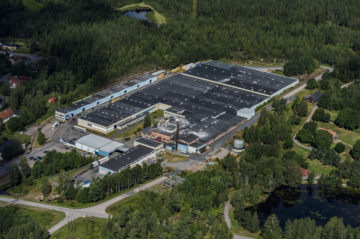 Flygfoto över Pauliströms pappersbruk i Vetlanda kommun.