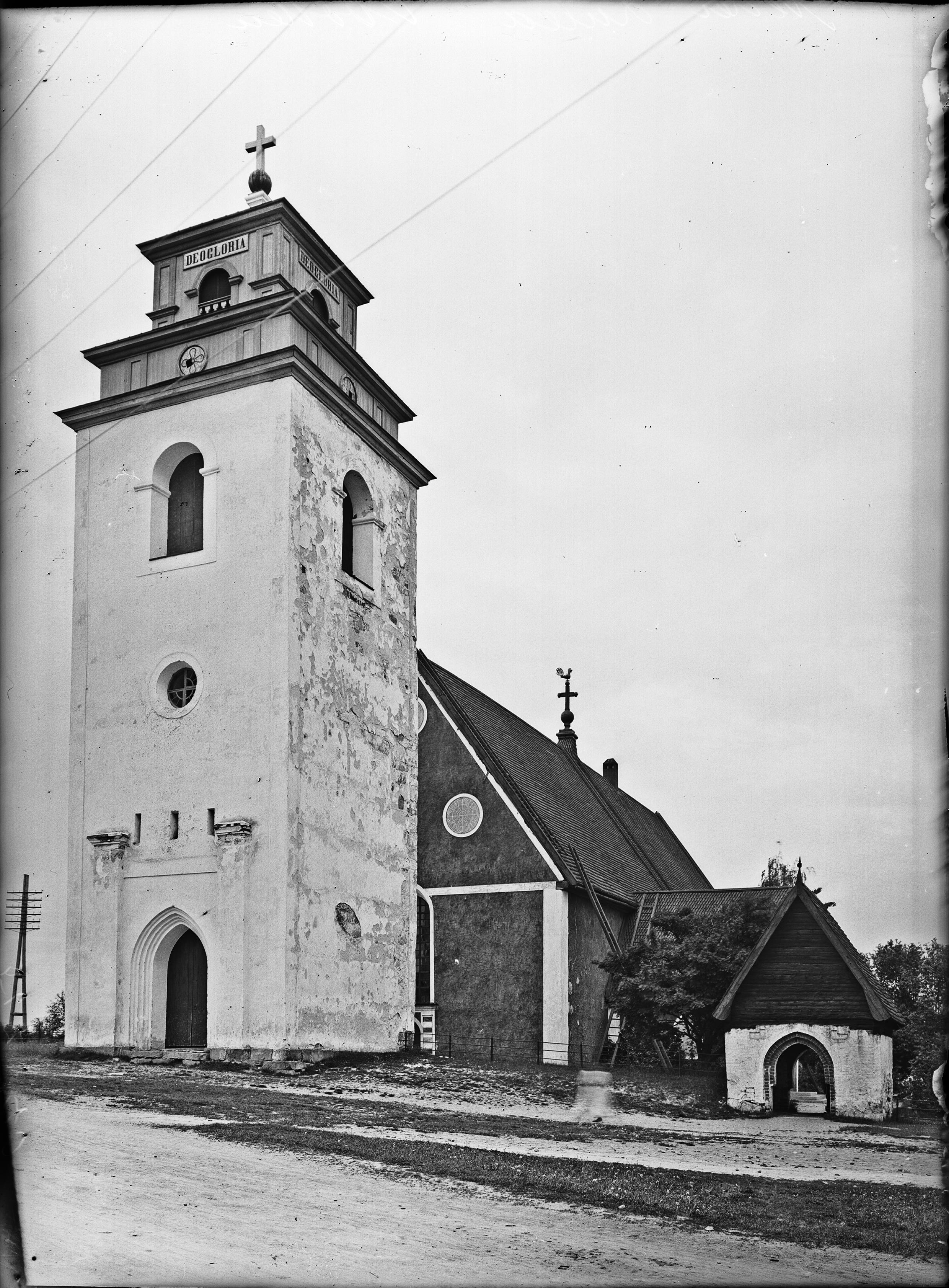 Kyrkan från sydväst med klockstapeln i förgrunden.