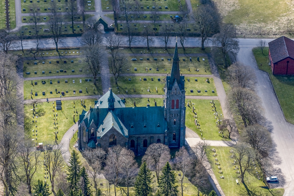 Flygfoto över Vallsjö kyrka i Sävsjö kommun.