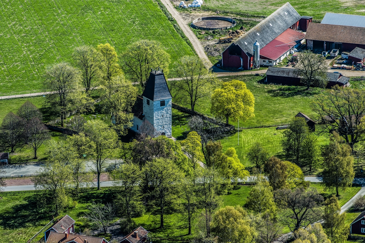 Flygfoto över Kumlaby kyrka på Visingsö.