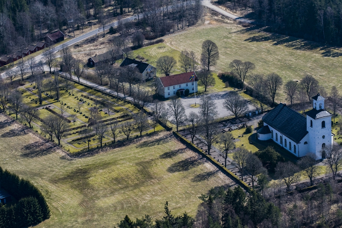 Flygfoto över Åkers kyrka i Vaggeryds kommun.