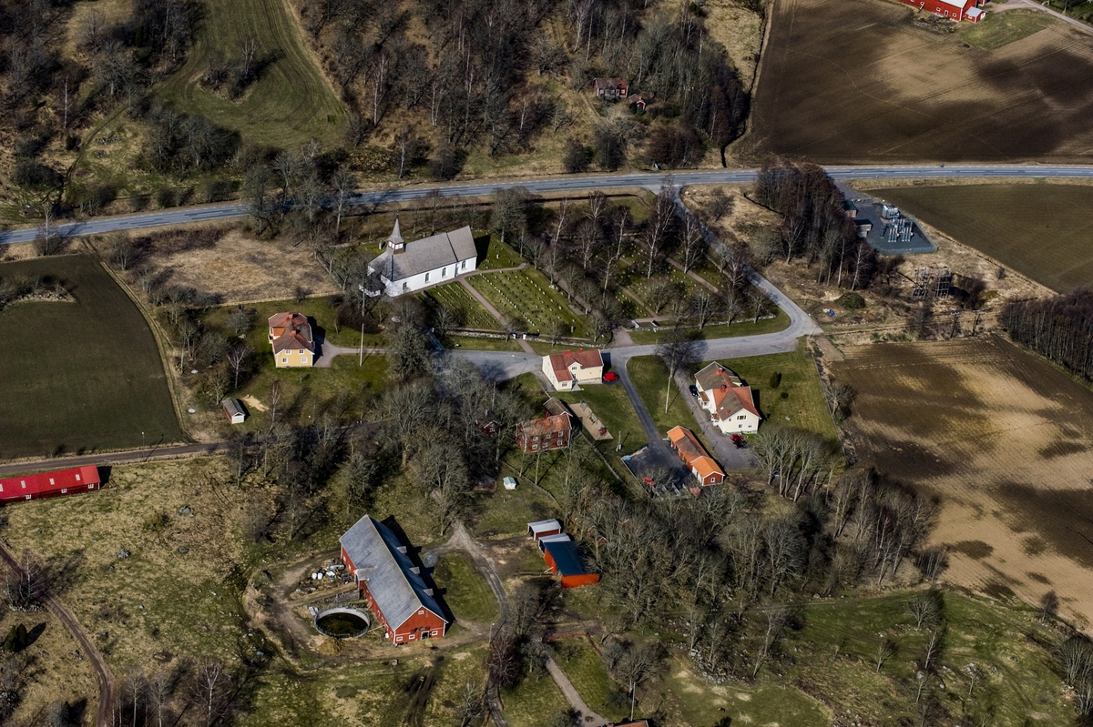 Flygfoto över Ölmstads kyrka i Jönköpings kommun.