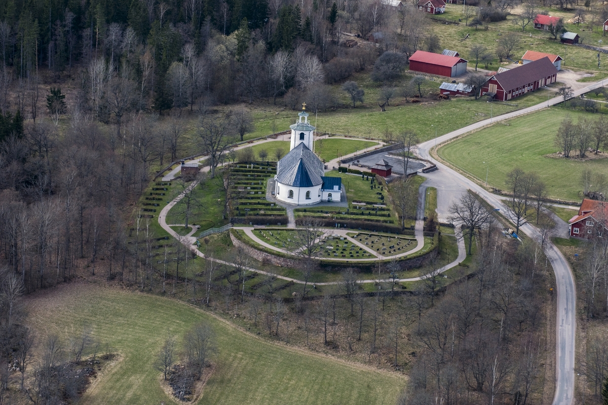 Flygfoto över Ökna kyrka i Vetlanda kommun.
