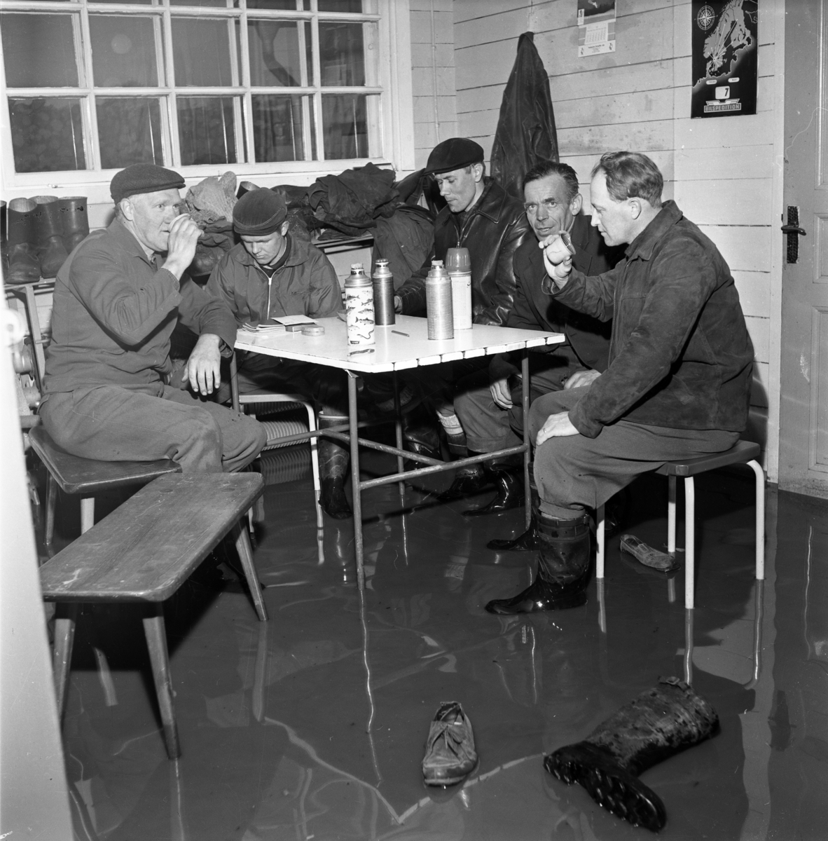 Paus hos parkförvaltningen. Det är översvämning och arbetarna sitter med vatten upp till anklarna, men de verkar obekymrade och njuter av kaffet i godan ro hos Huskvarnas stadsträdgårdsmästare Eric Letell. Från vänster sitter Bernhard Johansson, Ludvig Karlsson, Kurt Stenholm, Erik Thellbom och Stig Ekdahl. 1960-tal.