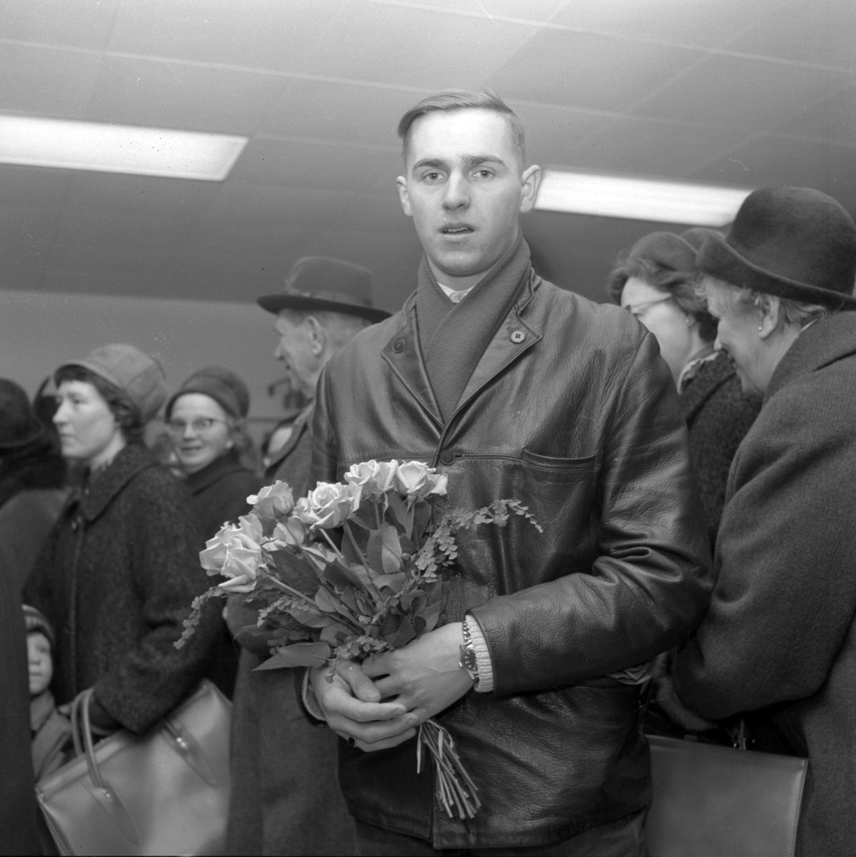 En man står i en folksamling med en bukett rosor i handen.