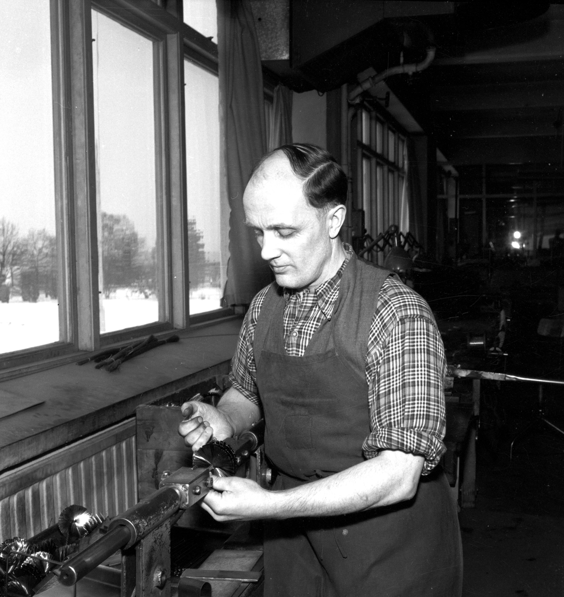 En man sitter vid en maskin och arbetar på Huskvarna Borstfabrik.