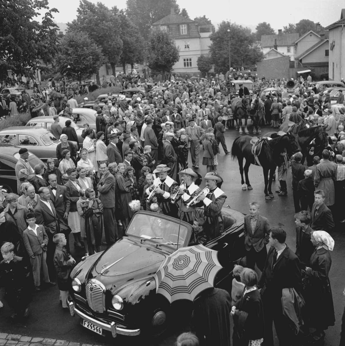 En bil med tre trumpetare " Stora Träffen" på Elverksplan i Huskvarna. Från vänster: Kurt Daag (1), Karl-axel "Putte" Björkman (2) och Gösta Thellbom (3).