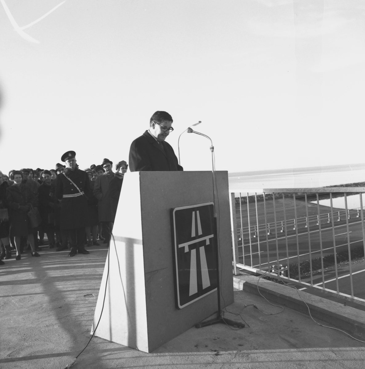 Landshövding Sven af Geijerstam står på bron vid Kruthuset i Huskvarna och invigningstalar vid den nya motorvägssträckan, E4, mellan Österängen och Brunstorp.