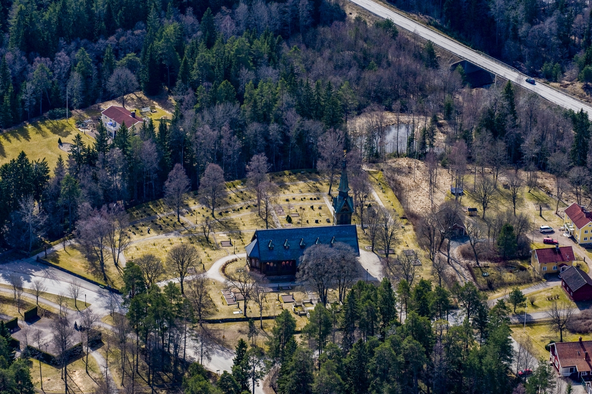 Flygfoto över Nykyrka kyrka i Mullsjö kommun.