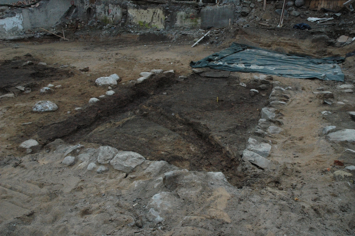 Hus/källare som framkommit vid en arkeologisk undersökning i kvarteret Abborren i centrala Jönköping. På bilden syns syllstenarna tydligt. Vid den bortre kortsidan syns en tröskelsten. Det mörka lagret invändigt har kommit sig av att källaren, kort efter byggandet, verkar ha fått problem med fukt och säkert även periodvis stående vatten. Som en lösning lade man först in flera lager av sand och trägolv men även detta drabbades av fukten. För att råda bot på detta permanent, hämtades använda gjutformar i bränd lera och lades på som ett tjockt golvlager. Lagret som var uppblandat med kol och sot var upp emot 0,3 meter tjockt. Golvnivån höjdes så mycket att en ny ingång måste göras och det är denna som syns vid tröskelstenen.