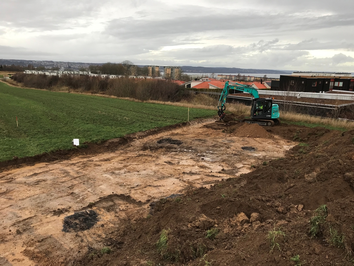 Översiktsfoto över norra delen av den blivande parkeringsplatsen med härdar och några stolphål synliga.