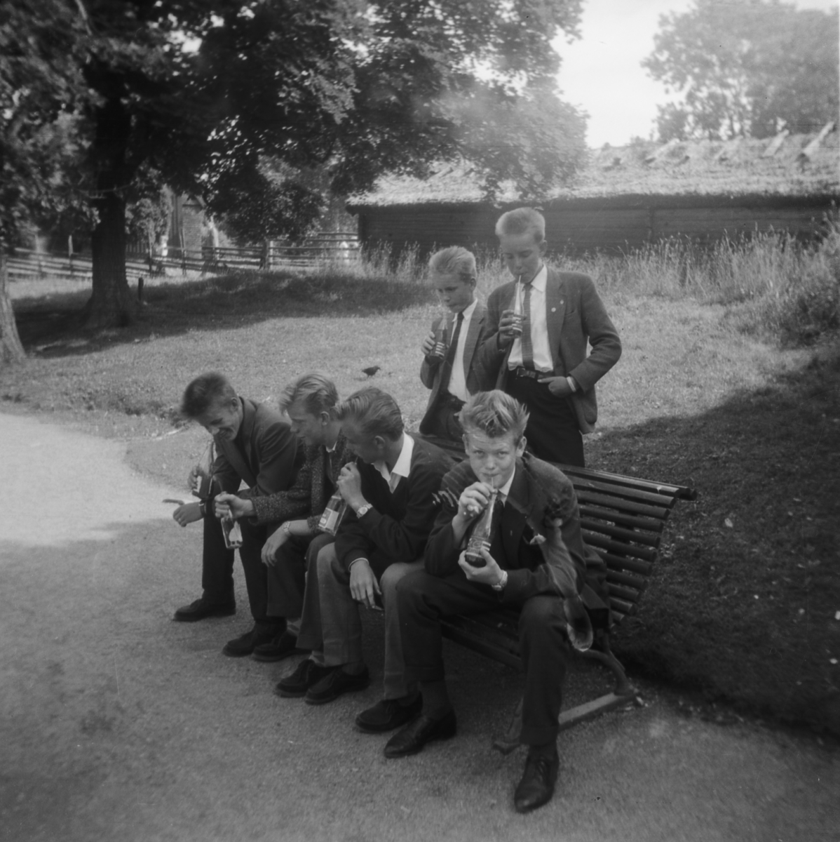 Ett gäng törstiga Huskvarnagrabbar har samlats vid en soffa.