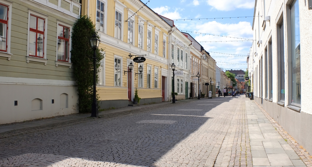 Smedjegatan, en gågata med butiker i Jönköpings äldre bebyggelse.