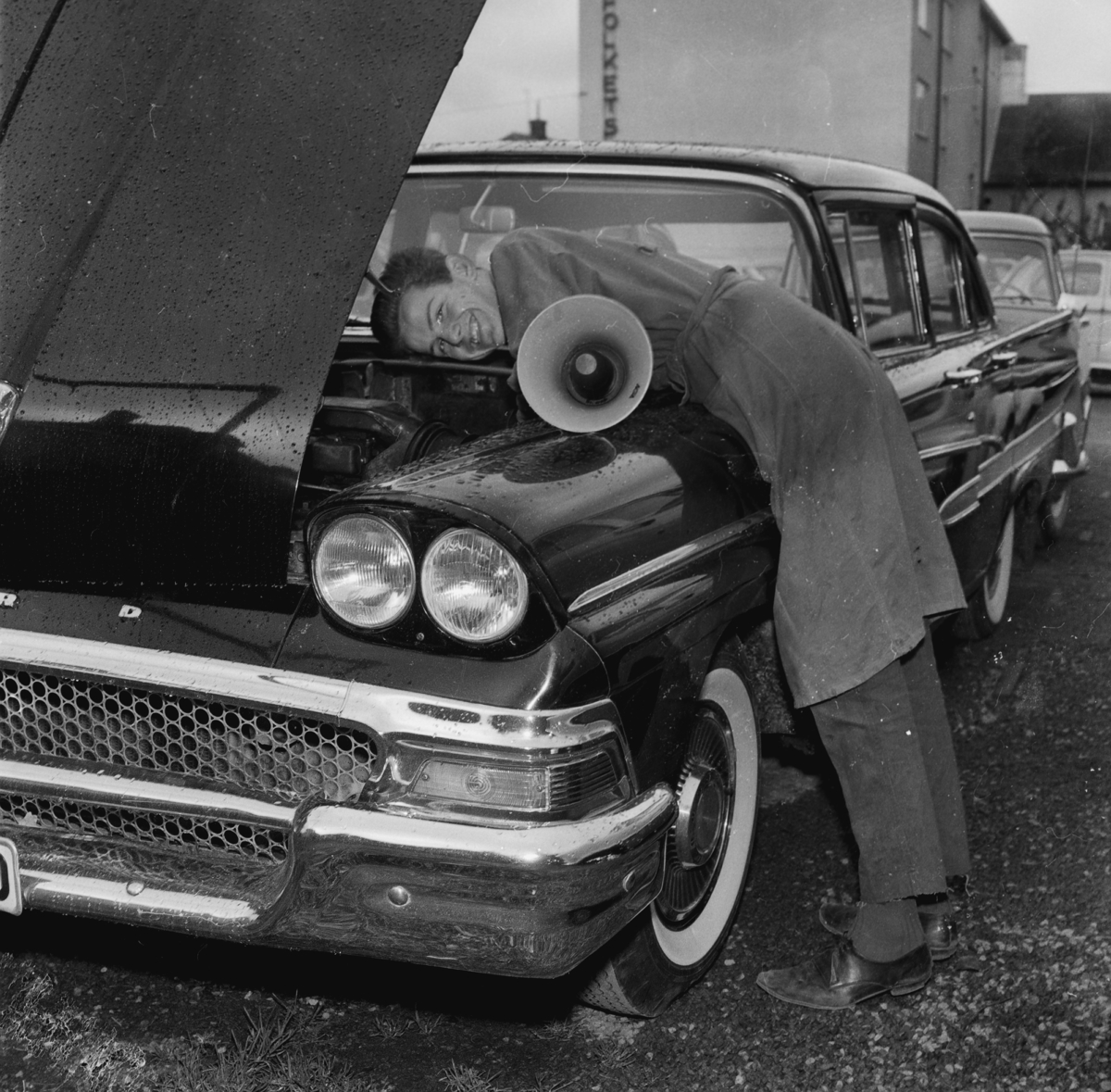 En man står lutad över en bil på en verkstad brevid folkets hus i Huskvarna.