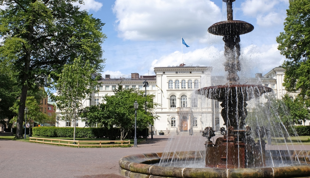 En del av Rådhusparken i Jönköping med Rådhuset i bakgrunden. Närmast står fontänen, tillverkad Av Bolinders i Stockholm.