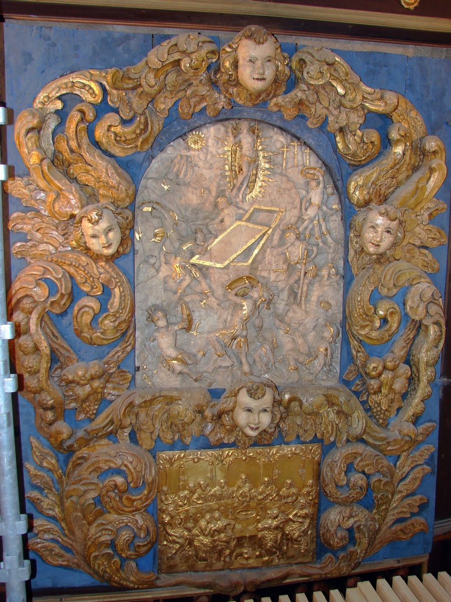 Detalj från altaruppsatsen i Brahekyrkan på Visingsö, Jönköpings kommun. Mittscenen med alabastertavla, metalltavla samt omgivande skulptural utsmyckning, efter konservering.