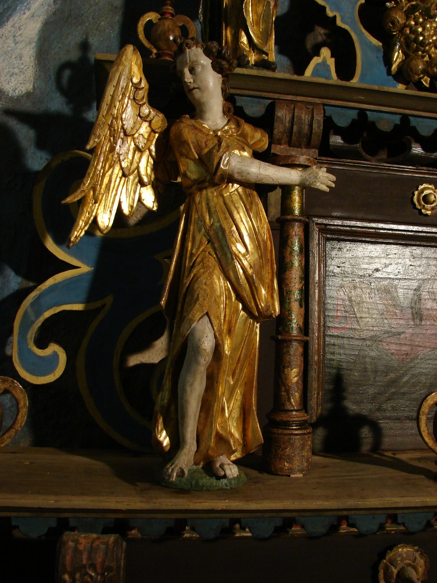 Detalj från altaruppsatsen i Brahekyrkan på Visingsö, Jönköpings kommun. Bilden visar en ängel på altaruppsatsens krön, efter konservering.