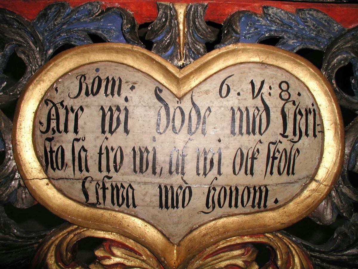 Textkartusch från Herman Mollerùs och hans hustru Gunnil Källebäcks epitafium i Brahekyrkan på Visingsö, Jönköpings kommun.