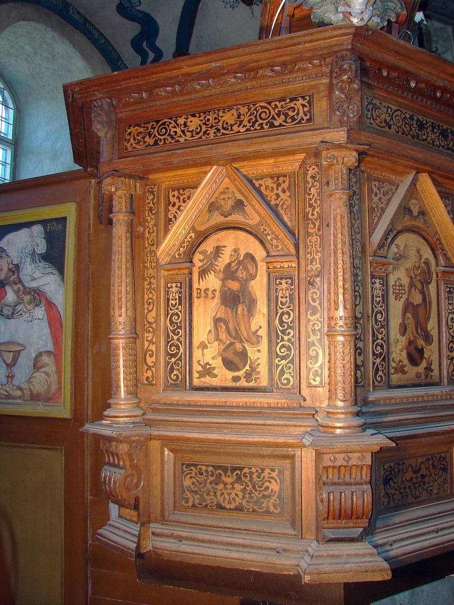 Detalj av predikstolskorgens sida som vetter mot väster i Brahekyrkan på Visingsö, Jönköpings kommun.