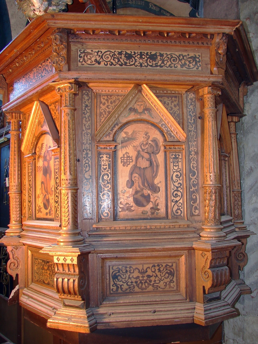 Predikstolskorgens sida som vetter åt söder ut mot mittgången i Brahekyrkan på Visingsö, Jönköpings kommun.