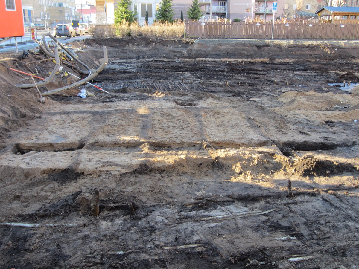 Odlingsbäddar på en rad av 9 stycken syns som sandfyllda rektanglar i kvarteret Citadellet 10, Jönköpings stad och kommun.