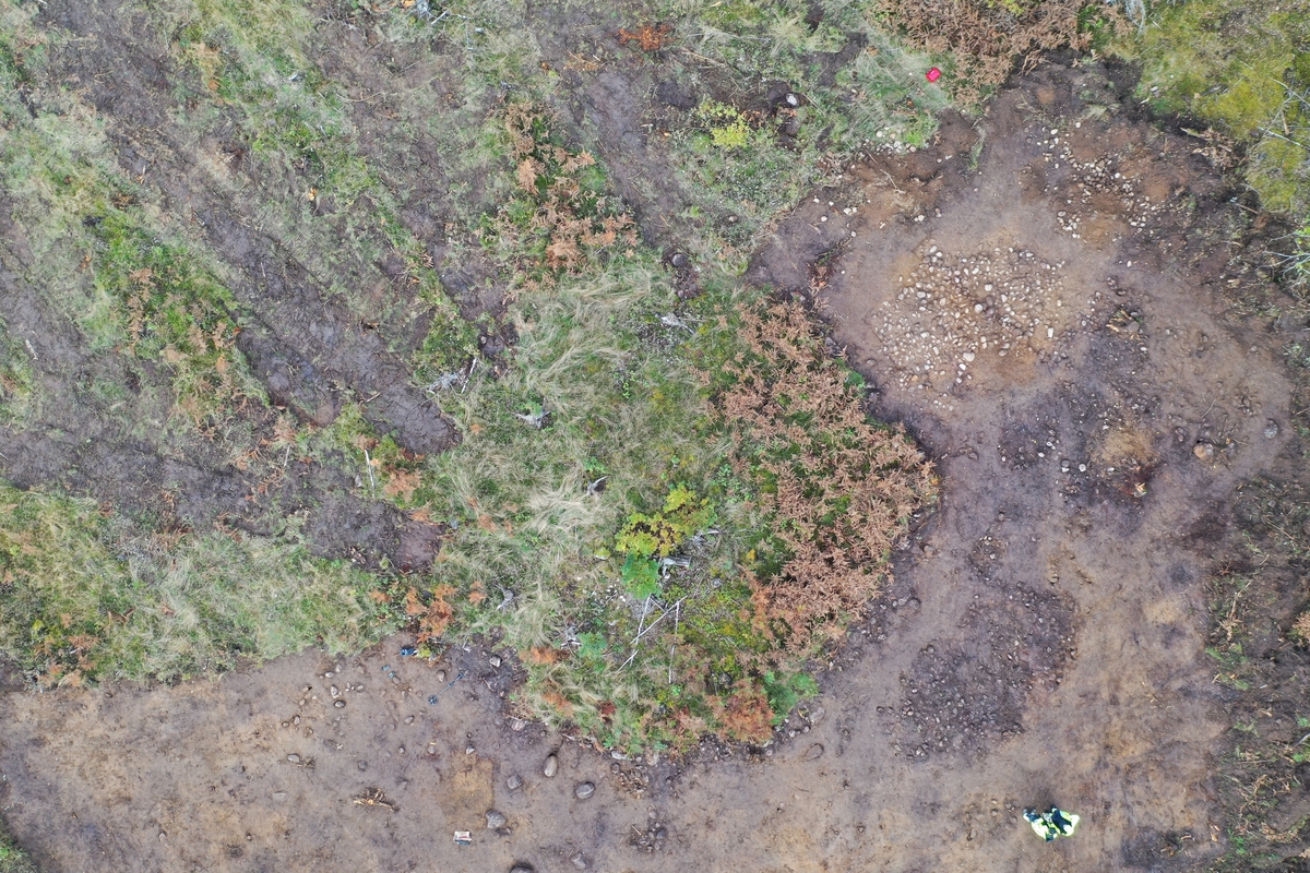Lodfoto över grav L1972:9236 med omkringliggande nypåträffade gravar från förundersökning i Skogslund/Hedenstorp, Jönköpings kommun.