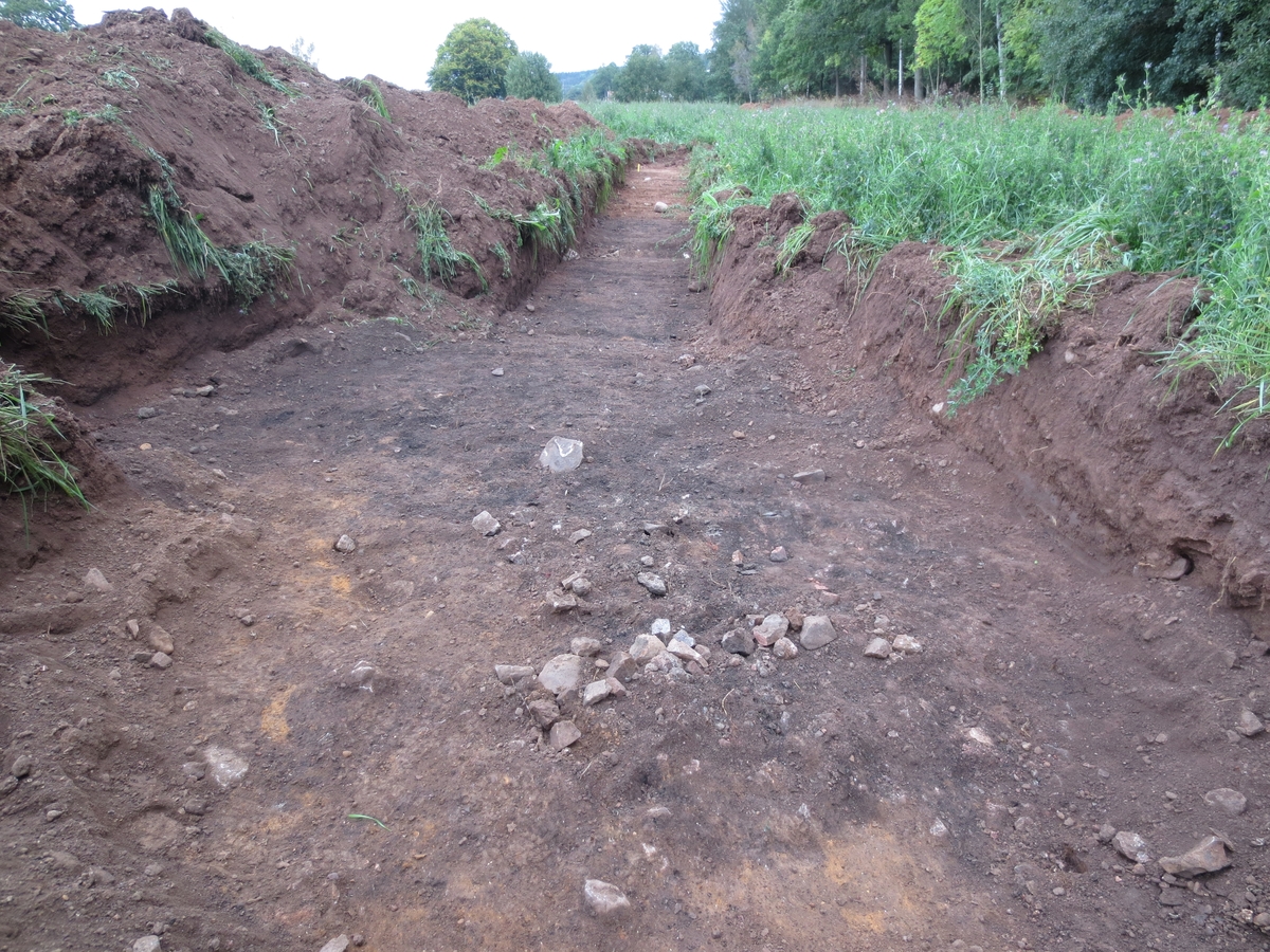 En härd i förgrunden, samt en kulturlagerrest, påträffad vid en arkeologisk utredning i Uppgränna, Jönköpings kommun.