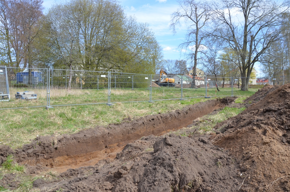 Arkeologisk förundersökning av herrgårdsparken vid Rosenlunds herrrgård, Jönköpings församling. Schaktet genom dammanläggningen strax nordväst om herrgårdsbyggnaden.