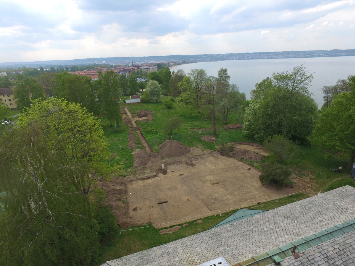 Arkeologisk förundersökning av herrgårdsparken vid Rosenlunds herrrgård, Jönköpings församling. Översiktsbild över herrgårdsbyggnaden och den framschaktade parterren som syns mot den ljusa sanden.