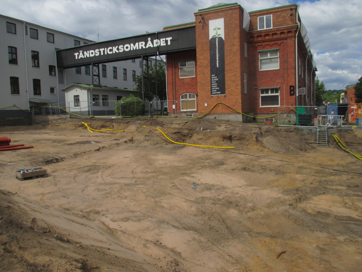 Förundrsökningsområdet efter maskinavbaning. Området med de intakta gjutformslagren ligger på en kvarlämnad avsats i områdets NV del.