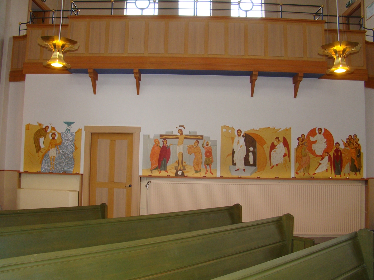 Örsjö kyrka, Nybro kommun. Interiör med väggmålningar i kyrkans nedre parti. Norra sidan.