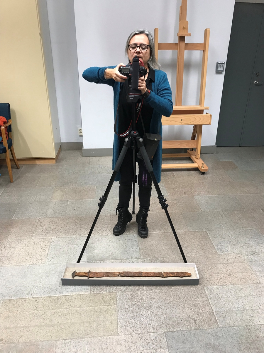 Länsmuseets fotograf Conchi Gonzales fotograferar ett svärd som ankommit till Jönköpings läns museum.