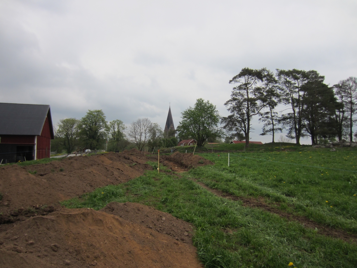 Arkeologiskt sökschakt med Lommaryds kyrka i bakgrunden. Bild tagen vid arkeologisk förundersökning i Lommaryd i Aneby kommun.