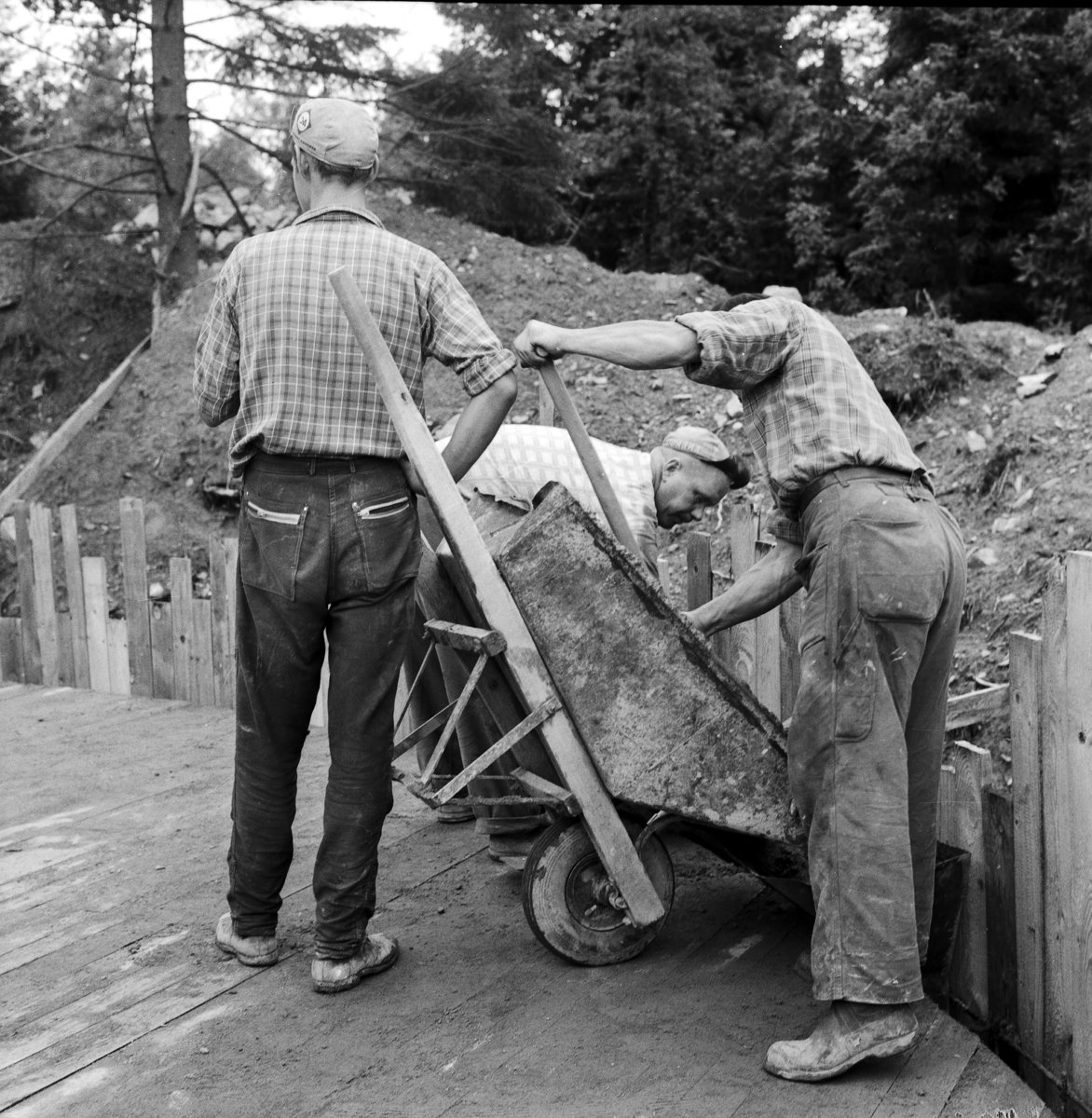 Några arbetare bygger på det nya vattentornet i Hakarp.,