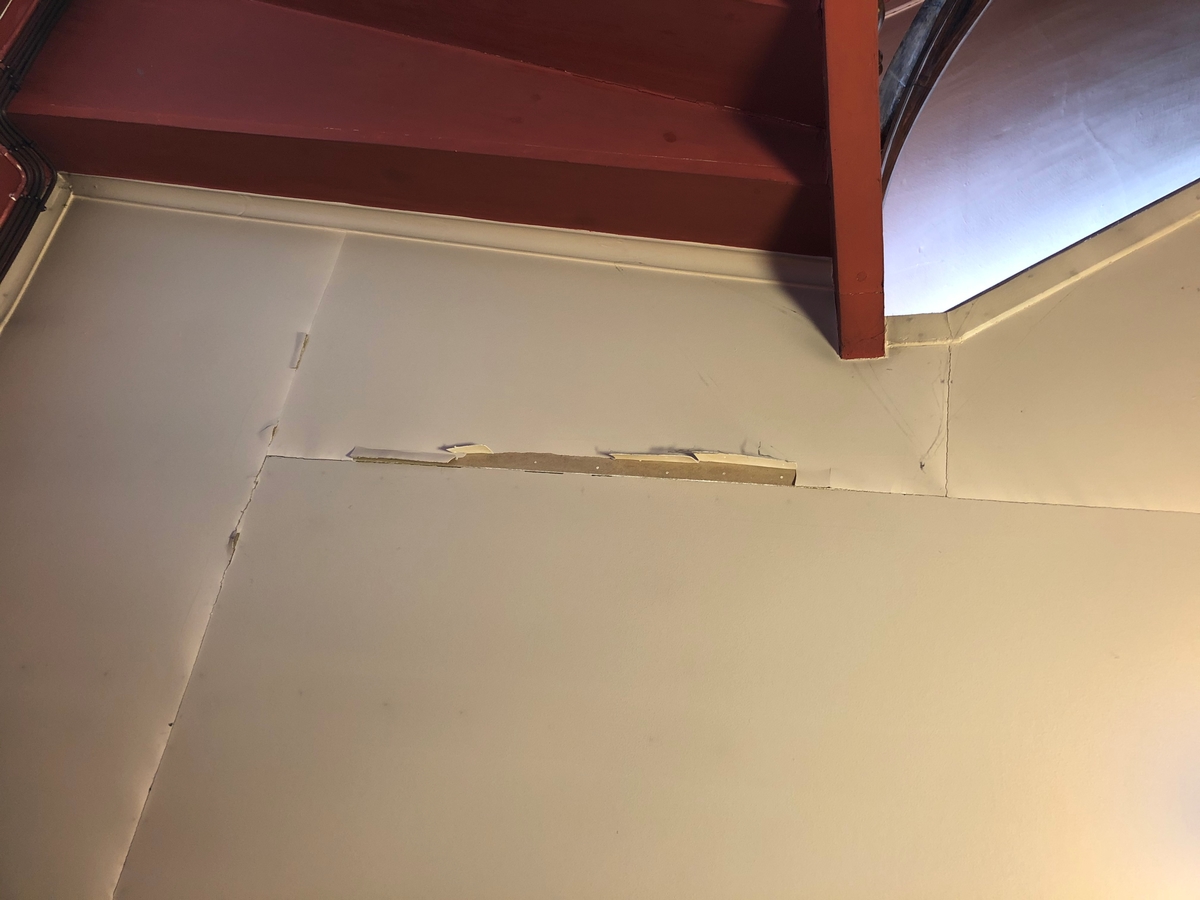 Aschanska gården, Eksjö. Trapphus. Skador i tak före åtgärd.