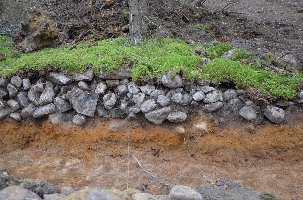 Röjningsröse halverat på mitten och undersökt i samband med en arkeologisk förundersökning i Frinnaryds socken, Aneby kommun.
