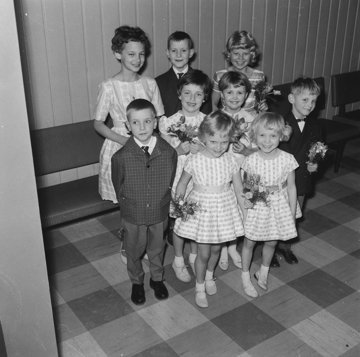 En grupp barn som håller blommor i händerna.