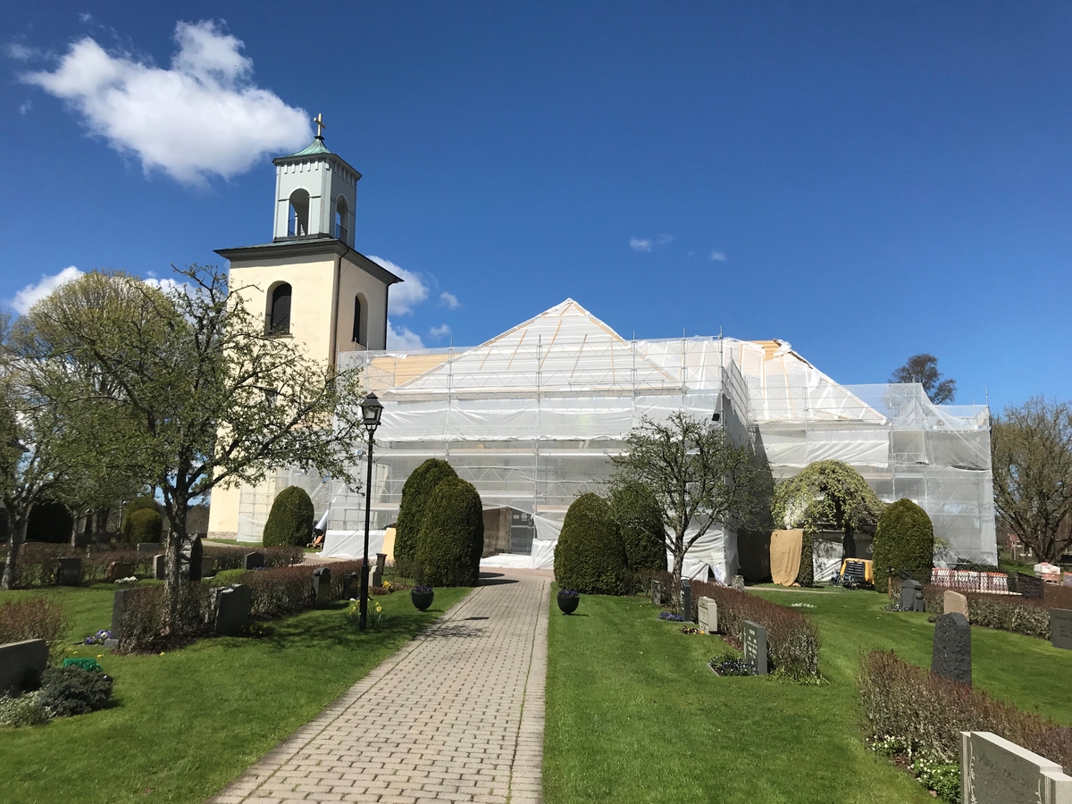Svenarums kyrka sedd från söder. Byggnadsställningar på långhus och kor.