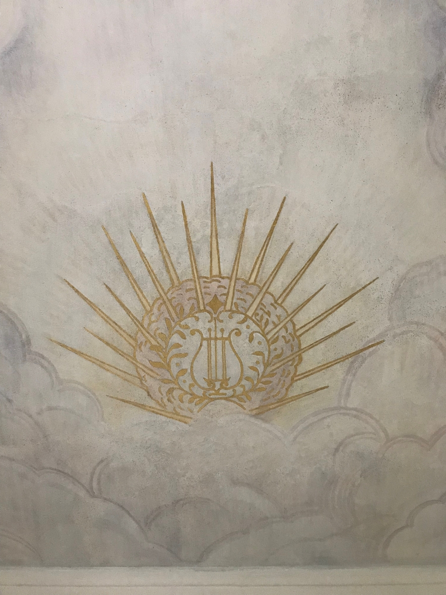 Christina Nilssons mausoleum på Tegnérkyrkogården i Växjö, Kronobergs län. Del av takmålning, strålkrans med lyra. Foto efter konservering.