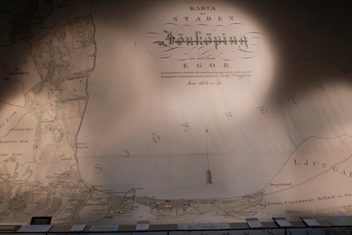 Stadshistoriska utställningen i arkivhuset. Karta över Jönköping, upprättad av Gustaf Liunggren 1854 och 1855.