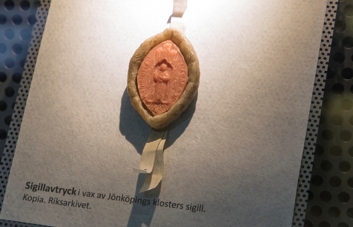 Stadshistoriska utställningen i arkivhuset. Sigillavtryck i vax av Jönköpings klosters sigill. Kopia. Riksarkivet.