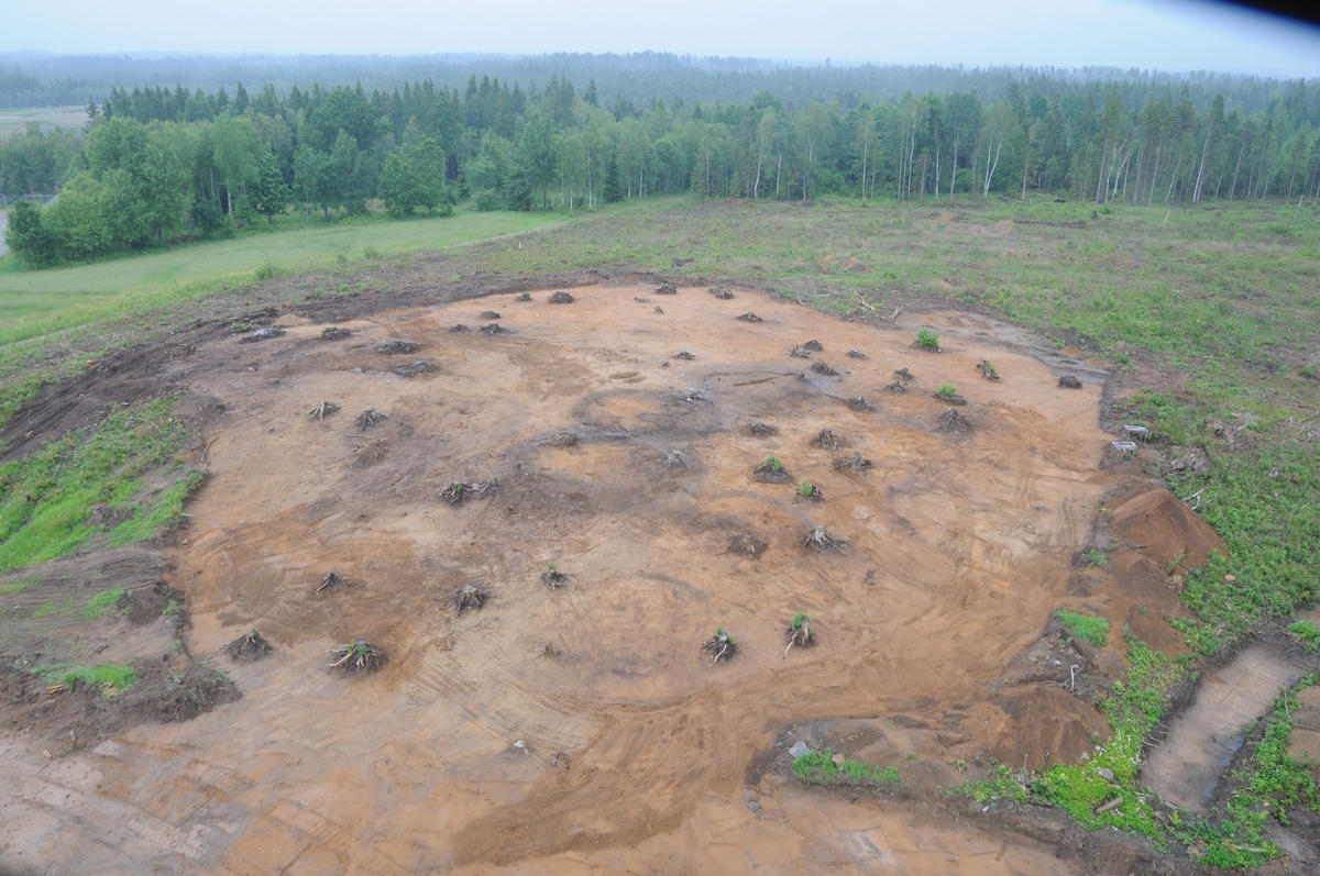 Översiktsbild över ett gravfält i Villstad socken i Gislaveds kommun. Centralt i bilden syns tydligt tre kantrännor som omringat varsin gravhög från vikingatiden.
