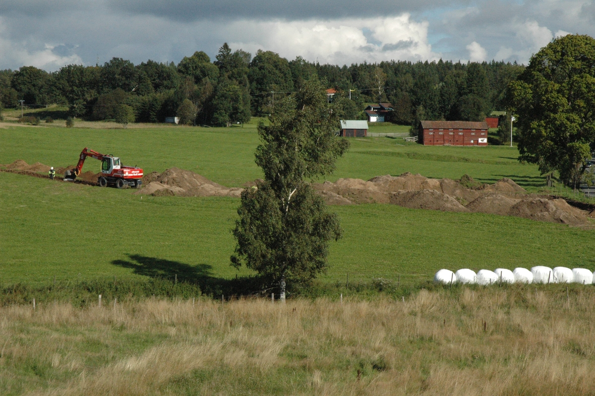 Översiktsbild över Odensjö bytomt tagen vid en arkeologisk undersökning sommaren 2010. I schakten till höger fanns lämningarna efter Västergården och vid skogskanten syns det timrade magasinet till Odensjö gård.