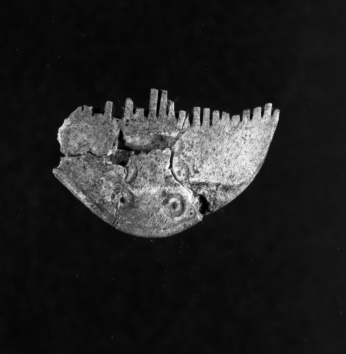 En benkam i horn som hittats vid en arkeologisk undersökning av ett gravfält i Byarum i Vaggeryds socken. Beskrivs som två tandplattor med passning, linje- och punktdekor. Fyndnummer JM55938:753.