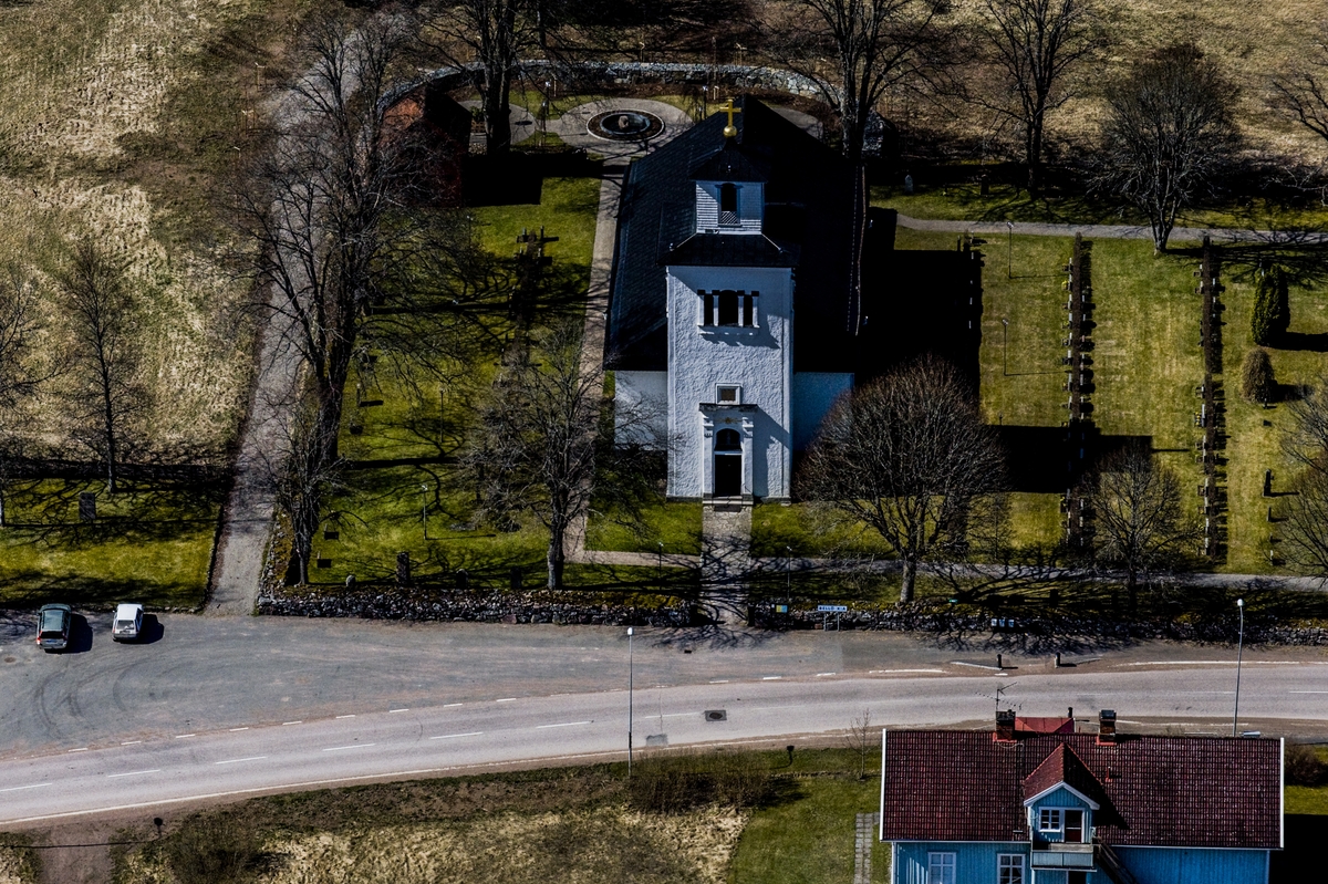 Flygfoto över Bellö kyrka i Eksjö kommun.