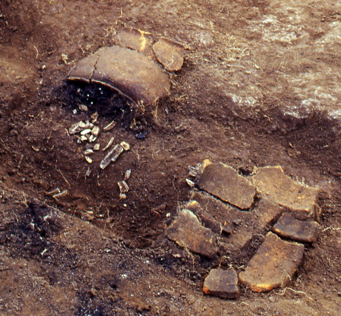 En kollapsad kruka med brända ben från gravfältet RAÄ Rogberga 19, L1973:5423 i Bogla i Rogberga socken, Jönköpings kommun.