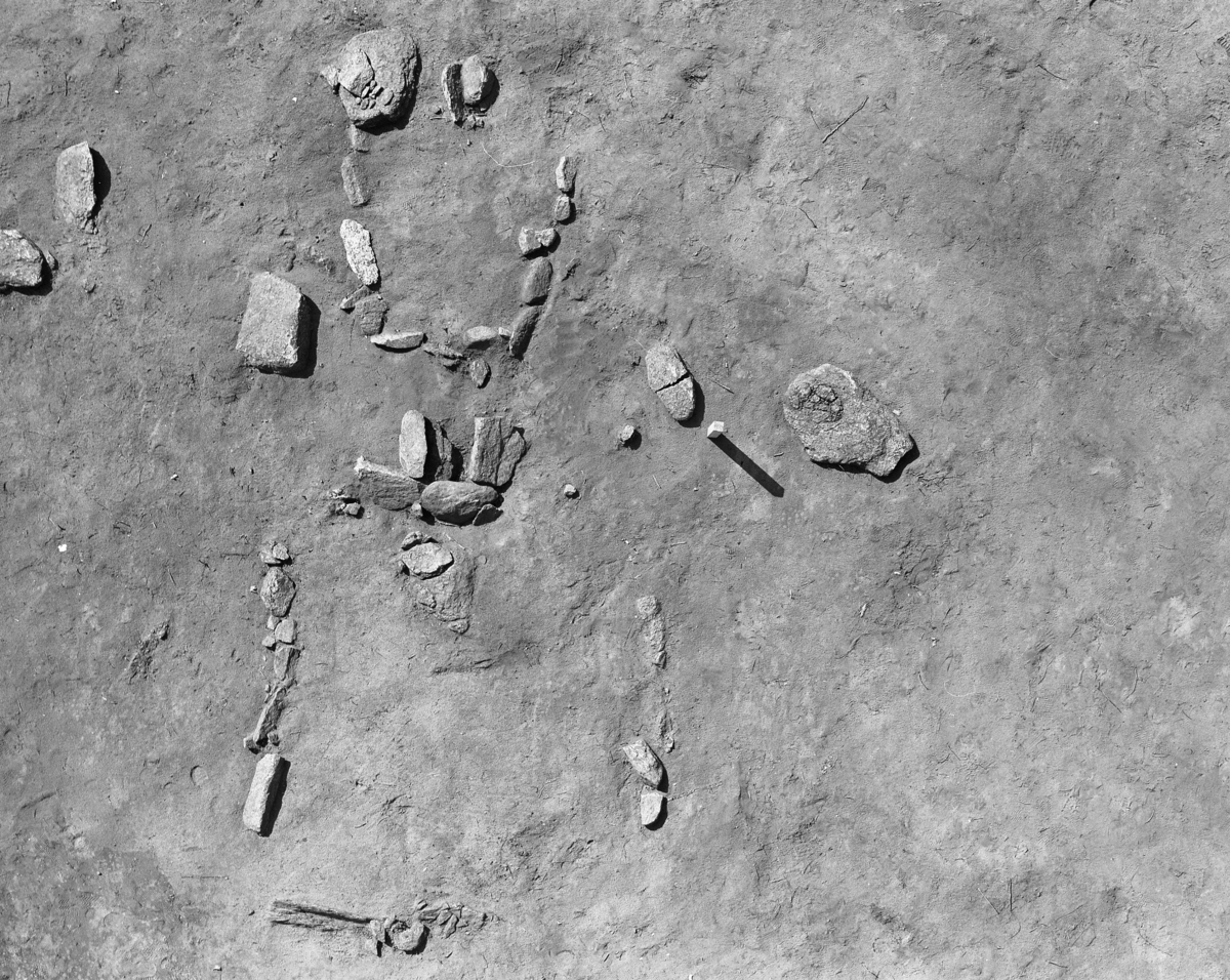 En kvadratisk stensättning, anläggning 3 (nederst) och en rektangulär stensättning (överst), anläggning 4, som framkommit vid en arkeologisk undersökning av ett gravfält i Byarum i Vaggeryds kommun.
