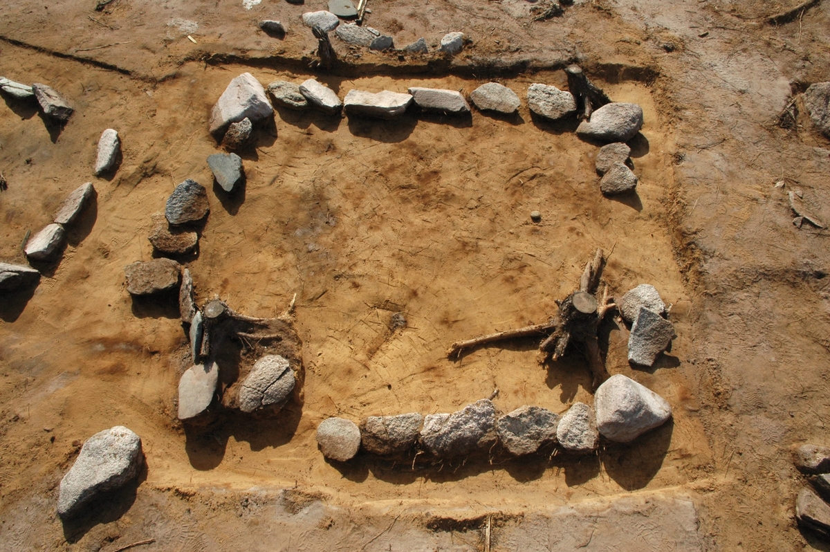 En ofylld, rektangulär stensättning, A 1275, som fotograferades i samband med en arkeologisk undersökning av gravfältet RAÄ Barnarp 29:1, L1974:2724 på Torsvik i Jönköping.